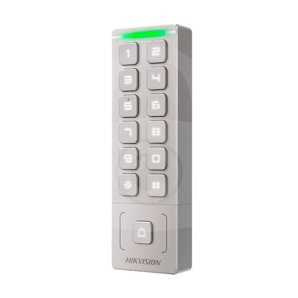 LECTOR DE TARJETAS PROX EM Y DE CÓDIGOS QR / TECLADO PARA CONTRASEÑA / COMPATIBLE CON CONTROLADORES DSK2600 SERIES HIKVISION / COMUNICACIÓN RS485 Y WIEGAND / IP65